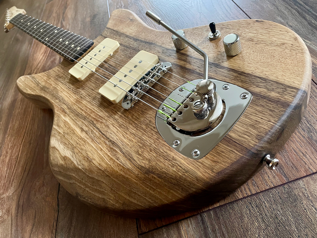 Der Hals ist klassisch, ein fettes C mit Vintage-Bünden und 7.25"-Radius (wahlweise 9,5"). Das Griffbrett ist wahlweise aus Räuchereiche (sehr Dunkel), Ovangkol oder Nussbaum gefertigt. Geschützt wird der Hals durch viele Schichten Öl und Wachs. So hast Du jederzeit das perfekte Spielgefühl.